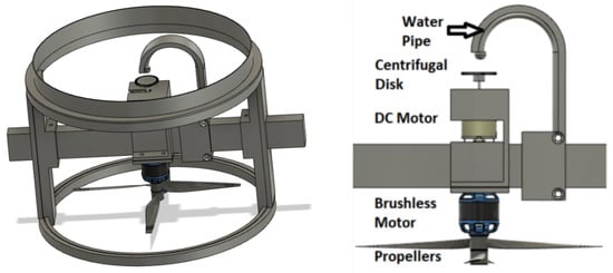 The system aerodynamics should also be improved to increase the air flow efficiency created by the propellers. The distance between the propellers and the aluminium plate, which forms the circular structure of each drum, should be reduced. The dimensions of the part supporting the water pipe can also be reduced to improve aerodynamics. Related to the air circulation, a change in the propeller motors to those with a higher power to cope with high leaf density can also be considered.