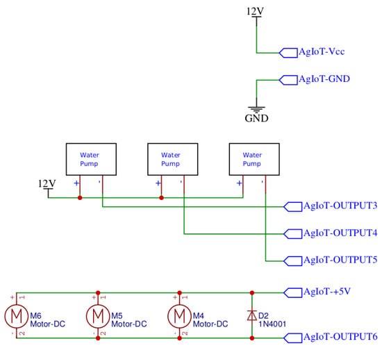 Figure 3. PRYSM sprayer electrical schematic: brushless motors and controllers (top), AgIoT power supply (center), and water pumps and DC motors supply (bottom).