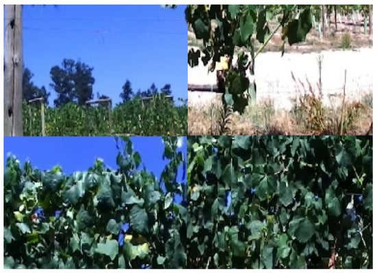 We selected three ROIs to feed the independent controllers of the three sprayer drums. These controllers needed to be fed the leaf area index, so it was selected using a classifier with four classes to reduce the system complexity. Typically, most vines are fully healthy (with all leaves) or simply dead, and the middle term is residual. Nevertheless, we added two more classes to produce a more precise system to consider this middle term. So, every image was manually annotated using an application that saved 1425 annotations in a text file. The application defines three ROIs (Figure 6, and then asks for the leaf density on each of the ROIs. The value is inserted in the four classes: 0% leaves, 33% leaves, 66% leaves, or 100% leaves. When there is no leaf in the region, it is considered 0%. When there are a few leaves, but in small quantities never exceeding half of the total area, it is 33%. If a large part of the area is covered with leaves, but not totally covered, it is considered 66%, and when the whole area is filled with leaves, it is considered a 100% class (Figure 7). This value is then saved in a text file together with the name of the image. The dataset is publicly accessible at [30].