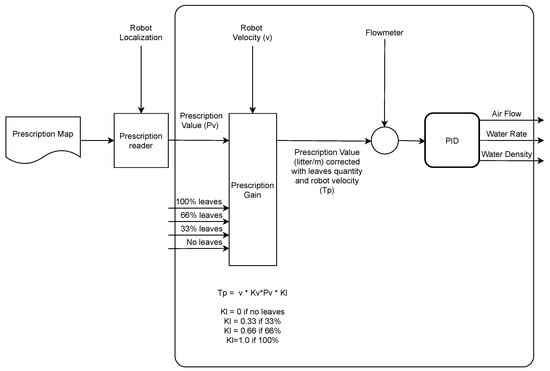 The controller system (Figure 9) is based on the prescription value, the robot velocity, and the quantity of leaves observed. The prescription value is obtained from the prescription map, which indicates the amount of product to apply in the different zones of the map from the location of the robot. In this way, with a prescription value, the robot velocity, the quantity of leaves, and the prescription gain, it is possible to obtain a corrected prescription value. The reference provided to the controller is obtained from the difference between this value and the water flow measured by the flowmeter.