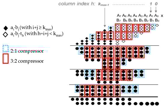 In this way, all the bits of the partial products belonging to the least columns are set to 0 regardless of the value of A and B. Therefore, the switching activity of the following compressors employed in the partial-reduction stage of the multiplier and belonging to the least columns is zero, and the multiplier energy consumption is reduced. The value of entails the energy-quality trade-off: the higher (lower) the , the lower (higher) the energy consumption and the result accuracy. Figure 1 depicts the principle of the dynamic column truncation technique applied to an 8 × 8 Wallace multiplier. In the same way as described in [], different values of the control signal , corresponding to a number of predetermined allowed accuracy configurations, can be stored in a ROM-based table and inputted to the multiplier according to the desired energy-quality trade-off.