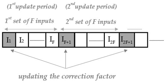 The proposed approach consists in updating the correction factor dynamically with an update period that can be tuned according to the energy-quality requirements. In Figure 2, the update period is indicated with F, which is defined as the number of consecutive inputs between two consecutive updates. The inputs involved in the updating processes are highlighted in grey. The dynamic configurability of approximate multipliers, such as in [,,,], can be exploited to periodically calculate the correction factor. A possible strategy can consist in performing two computations on the inputs highlighted in grey in Figure 2 and labeled with In(i−1)F+1, with i being the index of the updating period, one selecting an appropriate approximation threshold and the other one selecting the accurate mode. This is possible since the selected multipliers can dynamically switch among different accuracy configurations. The difference between the results of the two computations can be used as a correction factor for the following F − 1 multiplication.