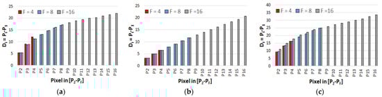 Analysis of the pixel value differences for different values of F and for the analyzed benchmarks: (a) airplane, (b) dark woman, (c) lake.
