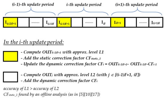 Indeed, instead of setting the multiplier to the exact operation mode, the latter can be configured with a relatively low approximate threshold. As a consequence, the accuracy of the value of CFi+1 is lower, but, in contrast, the energy dissipation of the computation on In(i−1)F+1 decreases. Moreover, in order to increase the result accuracy, the computation on In(i−1)F+1 is corrected by the static correction factor, CFstatic, found with an offline procedure supposing that input data are uniformly distributed, as typically performed in previous works. Ultimately, the proposed procedure can be summarized as described in Figure 4.