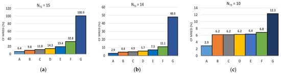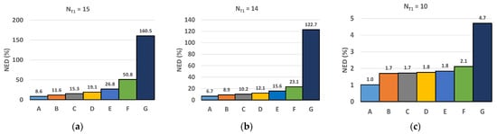 Obtained NED (normalized error distance) for a 7 × 7 convolution applied on the airplane benchmark: (a) NT1 = 15, (b) NT1 = 14, (c) NT1 = 10. F = 4. A: Proposed approach with NT2 = 0 and double computation on the same pixel to update the CFdyn. B: Proposed approach with NT2 = 0 and adopting simplifications (1) and (2). C: Same as B, with NT2 = NT1 − 2. D: Same as B, with NT2 = NT1 − 3. E: Same as B, with NT2 = NT1 − 4. F: Same as B, with NT2 = NT1 − 5. G: Conventional static correction with NT = NT1 truncated columns.