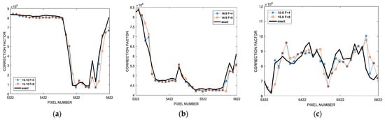 The correction factor updating process for a 7 × 7 convolution applied on the airplane benchmark for F = 4 and F = 8: (a) (NT1, NT2) = (15, 10), (b) (NT1, NT2) = (14, 9), (c) (NT1, NT2) = (10, 6).