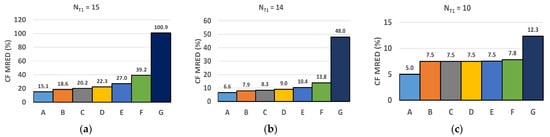 Obtained NED for a 7 × 7 convolution applied on the airplane benchmark: (a) NT1 = 15, (b) NT1 = 14, (c) NT1 = 10. F = 8. A: Proposed approach with NT2 = 0 and double computation on the same pixel to update the CFdyn. B: Proposed approach with NT2 = 0 and adopting simplifications (1) and (2). C: Same as B, with NT2 = NT1 − 2. D: Same as B, with NT2 = NT1 − 3. E: Same as B, with NT2 = NT1 − 4. F: Same as B, with NT2 = NT1 − 5. G: Conventional static correction with NT = NT1 truncated columns.