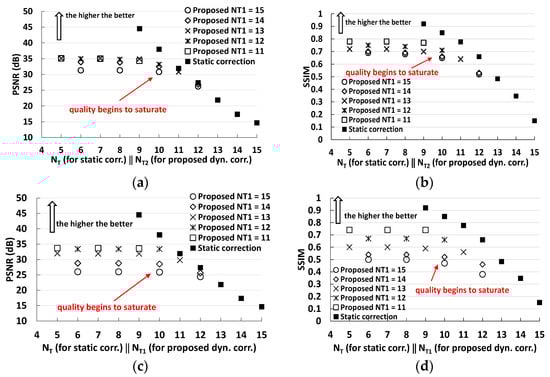 Quality results have been obtained by modeling the filtering operation of Equation (6) in Matlab, taking typical 8-bit 512 × 512 greyscale images as benchmarks []. Figure 11 depicts the peak-to-noise ratio (PSNR) and the structural similarity index metric (SSIM) of the filtered images for F = 4 and F = 8 respectively, averaged on three benchmarks: lake, dark woman and airplane. The analysis has been carried out by varying several multiplier parameters: the number of truncated columns (NT) for the standard approach (static correction factor), and the number of truncated columns in the lower accuracy (NT1) and higher accuracy mode (NT2) for the proposed correction approach. For each value of NT, the static correction factor related to the conventional procedure has been evaluated as the multiplier mean error obtained for 1 M uniformly distributed inputs. Several considerations can be drawn from Figure 11. Indeed, when a relatively low quality is required (PSNR < 34 dB or SSIM < 0.75), the proposed approach is able to work with NT1 > NT. This is preferable since the higher the number of truncated columns, the higher the energy saving. As an example, when its configuration is set to (NT1, NT2) = (15, 10) and F = 4, the new correction strategy leads to about the same PSNR as shown by the static correction technique for NT = 11. As expected, the novel approach shows a quality saturation as NT2 approaches a relatively low value, since the error correction factor does not show any further sensible accuracy increase for any further reduction of NT2. Such a behavior is in agreement with the considerations drawn by the analysis described in the previous Section 4. Indeed, as shown in Figure 6, Figure 7, Figure 8, Figure 9 and Figure 10, when NT2 approaches the value NT1 − 5 (histogram bar C), the MRED of the correction factor starts to converge to the ideal value corresponding to the case NT2 = 0 (histogram bar B). It follows that, when a higher output quality is required (PSNR > 34 dB or SSIM > 0.75), the simpler static correction technique shows quality results that are similar to those deriving from the proposed dynamic correction approach.
