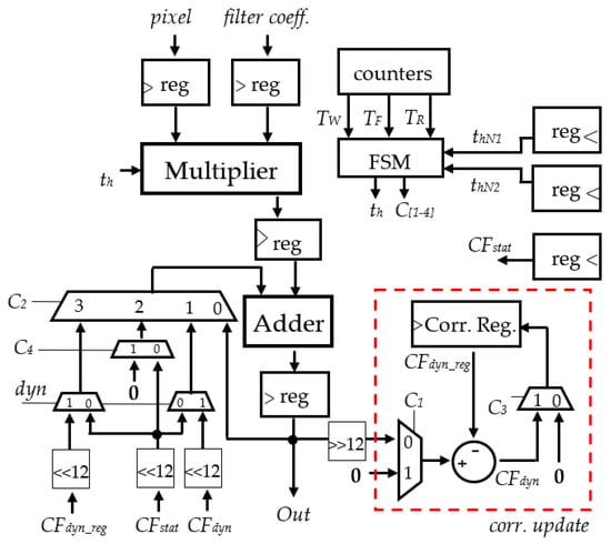 The hardware implementation of the analyzed Gaussian filter is described in Figure 12. It is based on a pipelined multiply-accumulate (MAC) circuit consisting of an 8 × 9 dynamically truncated unsigned Wallace multiplier and a 20-bit ripple carry adder (RCA)-based accumulator needed to accumulate the 7 × 7 multiplications of the filter described in Equation (6). The final accumulation is right-shifted by 12-bit positions to perform the division by 4096 and to obtain the final 8-bit filtered pixel. The circuit highlighted in red aims at updating the correction factor CFdyn periodically, as described in Section 3. Since the first pixel of each image row has no predecessor, we adopted the strategy to perform two computations on it, one with lower accuracy and the other with higher accuracy, and to obtain the first correction factor by the difference of the two results. A finite state machine (FSM) provides the multiplexers’ selection signals, C1–C4, and the truncation signals, th, to the multiplier, according to the definition of Equation (1). In the following, there is a description of the computational steps consecutively performed by the proposed hardware implementation.