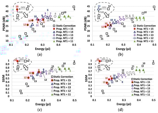 As expected, the MAC average energy dissipation per operation increases as NT and NT1 decrease. For the proposed approach, a higher value of F leads to a lower MAC energy dissipation because the time when the MAC is configured with a lower accuracy is larger. Moreover, the lower the NT and NT1, the higher the clock network energy dissipation because, as the number of truncated columns decreases, the number of clock-gated FFs decreases as well. The energy overhead of the extra counters is insensitive to the value of NT1, whereas it slightly depends on F. Compared to the single counter of the standard static correction approach, the extra counters needed by the proposed dynamic approach entail 15.6% (12.5%) more energy for F = 4 (F = 8). As expected, the higher the value of F, the lower the energy dissipation of the correction factor updating circuit. This is reasonable since a higher value of F means a lower activity for the circuit. In particular, from Table 2, it can be easily inferred that the energy dissipation of the correction factor updating circuit is halved when the value of F doubles. Anyway, the extra energy dissipation of the correction factor updating circuit and extra counters represents a very small percentage of the total energy dissipation: up to 3.8% and 3% for F = 4 and F = 8, respectively. It is worth noting that the accurate MAC has a slightly lower minimum clock period constraint (447 ps), 2.8% lower than the delay of the proposed design, since the partial product generation stage of the accurate multiplier exploits 2-input AND gates rather than 3-input AND gates. Moreover, the area overhead of the proposed design with respect to the accurate one is about 46%, since the latter does not need clock gating latches. The energy consumption of the MAC designed according to the proposed approach is up to 72% and 76% lower with respect to the accurate MAC for F = 4 and F = 8, respectively. Figure 13 depicts the energy-quality trade-off for the standard and proposed designs for different values of NT1 and NT2. The quality has been evaluated with three metrics: PSNR, SSIM and NED. As expected from the preliminary analysis of Figure 11, the proposed methodology shows a quality saturation for low values of NT2, thus the standard approach is preferable when a higher quality is required (PSNR > 32 dB, SSIM > 0.7, NED < 1%). On the contrary, for lower-quality values, the proposed methodology shows a better energy-quality trade-off. As it is visible in the insets of Figure 13, the energy consumption is reduced by up to 34%, 34% and 20% at the parity of PSNR, NED and SSIM, respectively. Similarly, the proposed technique can improve the PSNR, the NED and the SSIM by up to +9 dB, −4× and +35% respectively, at iso-energy. The energy saving is even higher if we consider only the energy consumption of the clock network, the multiplier, the adder and the correction update circuit (when applied). Indeed, the remaining components can be shared among several MACs if the computation is parallelized. In such a scenario, the proposed design can reduce the energy dissipation by up to 44%, 44% and 29% at iso-PSNR, iso-NED and iso-SSIM, respectively. Finally, when a high quality is required, the proposed design needs to be configured to work with a constant correction factor (dyn = 0); in such a case, the proposed design has shown a negligible extra power consumption with respect to the standard design (less than 1.5%).