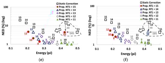 Energy-quality trade-off for the standard and proposed approaches: numbers close to the symbols indicate the values of NT (for the standard static approach) and NT2 (for the proposed dynamic approach). (a–c): F = 4, (d–f): F = 8.