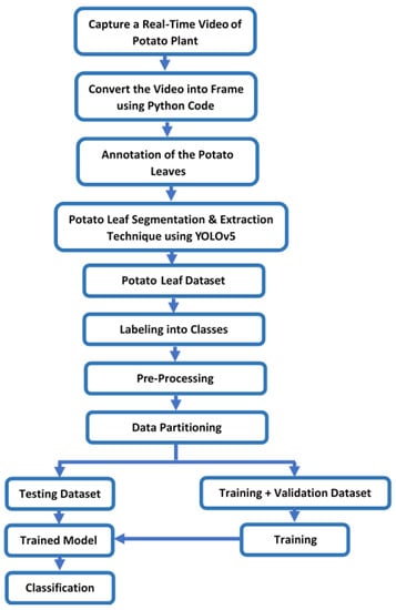 Capture the real-time videos and images of Potato plants from the lab and field environment. Convert the videos to frames (images). Annotate the potato leaf images (single class) and save the annotation in YOLOv5 and XML format. Divide the Potato Leaf Images Dataset into training, validation and testing sets. Pre-processing (auto-orient and resize) is applied to the annotated images. Pre-processing (data augmentation) is applied to the training set. Save the Potato Leaf Images Dataset into YOLOv5 PyTorch format. Upload the dataset into google drive. Train and validate the custom YOLOv5s model with the help of Google Colab by using the Potato Leaf Images Dataset. Classification output of YoloV5s model and using the annotations of Potato Leaf Images Dataset, potato leaves were extracted/segmented and made Potato Leaf Disease Dataset (PLD). Label the images of PLD with the help of plant pathologists with their respective classes. Pre-process all the images by applying data augmentation. Divide the dataset among training, validation and testing with 80%, 10% and 10% ratios, respectively. Train the CNN model with the help of training images. Use the validation images to validate the CNN model at the end of each epoch. Save the Trained PDDCNN Model. Testing is applied to the PDDCNN trained model using testing images.