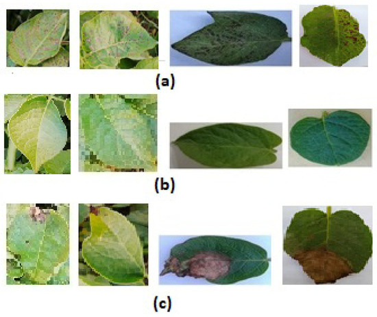 23]. The PlantVillage dataset was developed by Penn State University (US) and EPFL (Switzerland), which is a non-profit project. The database consists of JPG colour images with 256 × 256 dimensions. It has 38 classes of diseased and healthy leaves of 14 plants. The focus of this research is on the potato crop. Therefore, 1000 leaves for late blight, 1000 leaves for early blight, and 152 images of healthy leaves were selected for the experimental purposes, as shown in