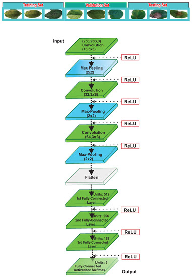 In the convolutional process, the input volume was convolved with the weights. The convolved matrix might be shrunk or expanded depending on the stride and padding. The convolutional process reduced the spatial height and width, but depth was increasing. Each convolutional layer applied the ReLu nonlinear action function, which converted the negative values to zero and reduced the vanishing gradient probability. It used pooling to reduce the computational cost and spatial size. Max pooling was applied to down-sample the images, which reduced the overfitting and improved the activation function’s performance, thus improving the convergence speed. A fully connected or dense layer was the final output layer responsible for predicting a potato leaf image class.