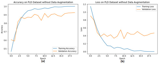 The entire PLD dataset was divided into three parts, training, validation and testing. The training dataset was used to train the PDDCNN model, while we utilised the validation and test dataset to evaluate the proposed model’s performance. Therefore, we split the training, validation and testing datasets with 80%, 10% and 10%, respectively. For the PLD dataset, 3257, 403 and 403 images for training, validation and testing were used, respectively. Different data augmentation techniques performed on the training set, i.e., rescaling, rotation, width shift, height shift, shear range, zoom range, horizontal flip, brightness and channel shift with the fill mode nearest to increase the diversity and enhance the dataset. It would overcome the overfitting problem, thus ensuring the generalisation of the model.