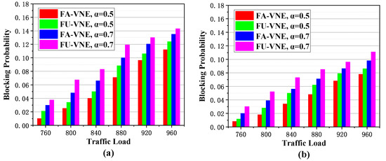 In the simulation, we use the FU-VNE algorithm as a baseline for comparison. Figure 4a–d shows the performance in terms of the Blocking Probability (BP) of FA-VNE and FU-VNE under different NSs. Each sub graph in Figure 4 takes blocking probability as the y-axis, which represents the blocking probability of the VON services in each NS. Taking traffic load as the x-axis, the values shown at each point are the expected values of the blocking probability of 5000 VON Poisson services under the corresponding traffic load. The first bar and the third bar of each traffic load are the proposed FA-VNE algorithm with α values of 0.5 and 0.7, while the second bar and the fourth bar are FU-VNE as a comparison algorithm, and α value is also set to be 0.5 and 0.7, respectively.