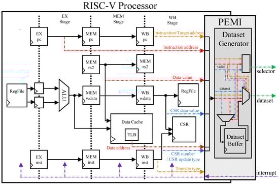 As a security extension to RISC-V processor, PEMI extracts internal processor states, which are indispensable to RiskiM for verifying kernel integrity, comprehensively. In particular, PEMI extracts the execution information for the memory write instruction, CSR update instruction, and control transfer instruction. As described in Section 1, since these instructions change the current state of the kernel, so it is essential to verify the changes caused by these instructions to ensure kernel integrity. PEMI represents the extracted information as a 3-tuple dataset and sends it to RiskiM. Three datasets are as follows: