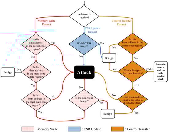 There have been numerous studies using architectural supports to monitor the malicious activities of the software running on top of the processor. Some works leveraged hardware performance counters (HPC), which is a set of special-purpose registers holding the counts of the hardware-related events such as cache hits and misses. According to the monitored counts, they implemented detection solutions for malware, side-channel attack and integrity attack []. However, these counters cannot provide more specific information, such as the target addresses of executed indirect branch instructions. Intel architecture [] provides hardware features to extract internal information of the processor, such as last branch record (LBR), branch trace store (BTS) and processor trace (PT). Many works utilized these features to enforce the control flow integrity [,,,,,]. However, as described in Section 4.5, since they can only trace the program execution, data-only attacks cannot be detected through them. ARM architecture also provides embedded trace macrocell (ETM) []. Unlike hardware features in Intel architecture, ETM can be configured to trace the data information (data address and value) as well as the program execution. However, two traces are coming from different channels, complex hardware design is inevitable to generate the memory write dataset unlike PEMI. In RISC-V, Rocket processor provides a special processor interface to provide internal processor information to the external coprocessor, called rocket chip coprocessor (RoCC) interface []. PHMon [] used RoCC to implement several security solutions in a separate hardware. However, unlike RiskiM, PHMon is designed to protect the user application not the kernel, and the kernel code should be modified in PHMon.