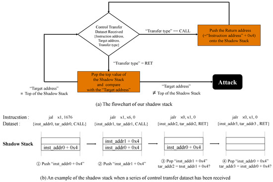 - Check for the control transfer datasets. Along with the sensitive data structures and CSRs, the control data, such as return address in the stack, should be protected. Otherwise, the attacker can take control of the kernel. For example, if an attacker can change the control flow of the kernel, she can launch a code reuse attack (e.g., return-oriented programming (ROP) attack). To prevent this, we implemented shadow stack [], a well-known protection mechanism for attacks to return address. The shadow stack itself refers to a separate stack that is designed to store return addresses only. At the function prologue, the return address is stored in both call stack and shadow stack. Then, at the function epilogue, two return addresses are popped from both stacks and compared to detect whether the return address in the call stack is tampered by an attacker or not. RiskiM implements the shadow stack using the control transfer datasets received from PEMI. First, RiskiM identifies whether the dataset represents the behavior of the OS kernel. In other words, RiskiM checks whether the instruction address in the dataset is in the kernel code region. If yes, RiskiM performs the operations for the shadow stack (Figure 4a). If the transfer type is CALL type, the return address (i.e., Instruction address + 4) is stored in the shadow stack. In the current implementation, the shadow stack in RiskiM can hold one thousand entries. Then, if the transfer type is RET type, the latest return address stored in the shadow stack is popped and compared with the target address. Thus when the two addresses do not match, RiskiM signals PEMI to notify the occurrence of the attack. Figure 4b shows the change of the shadow stack when RiskiM receives a series of control transfer datasets (① CALL- ② CALL- ③ RET- ④ RET). Note that the control transfer dataset includes information about branches other than call and return. Therefore, RiskiM can be configured to defend against attacks that use indirect branch (e.g., jump-oriented programming).Figure 4. The Concept of Shadow Stack.