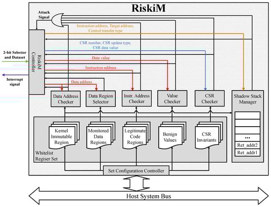 As shown in Figure 5, RiskiM is composed of seven submodules: set configuration controller (SCC), whitelist register set (WRS), data address checker, data region selector, instruction address checker, value checker, CSR checker, shadow sack manager and RiskiM controller. In this section, we describe the role of each submodule in detail.