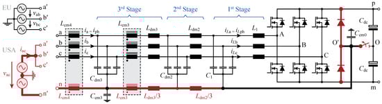 Finally, the filter stages directly connected to the switching stage, e.g., the 1st filter stage, do not comprise a CM choke, cf. Figure 2. The reason is that a 4-phase CM choke, during 3-phase operation (where the relay is in the on-state), would short circuit the zero sequence voltage inherently generated by the 2LB6 topology. Instead of that, the CM choke is placed close to the mains-side interface of the EMI filter where it is fully effective, i.e., in Figure 2. Furthermore, in anticipation of the detailed analytical investigation conducted in Section 4, a second CM choke is placed in the 3rd filter stage (), together with a CM EMI filter capacitor between the two CM chokes.