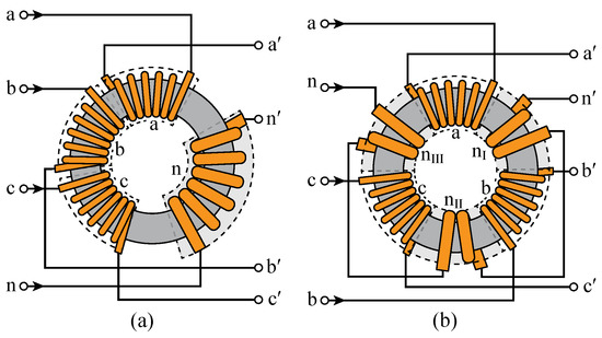 Two different constructions of a 4-phase CM choke with toroidal core and 6 turns per phase: (a) the winding of the 4th phase is not split apart and (b) the winding of the 4th phase is split into three parts that are connected in series. © 2019 IEEE. Adapted from Ref. [12].