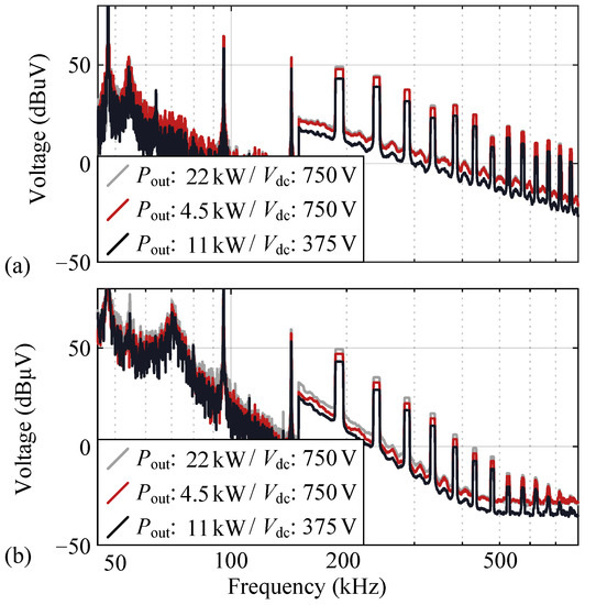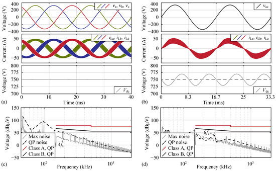 Figure 5c,d depicts the simulated spectra of the conducted EMI, which verify the validity of the presented analytic considerations (“max. noise” in Figure 5c,d denotes the maximum estimation according to (4)). In addition, the absence of frequency multiples equal to {, }, , in 1-phase operation is depicted.