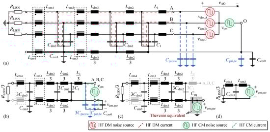 (a) HF equivalent circuit of the 2LB6 converter shown in Figure 2, for 3-phase operation; (b) CM equivalent circuit; (c,d) effective CM equivalent circuit, derived in the style of [31,32]. © 2019 IEEE. Adapted from Ref. [12].