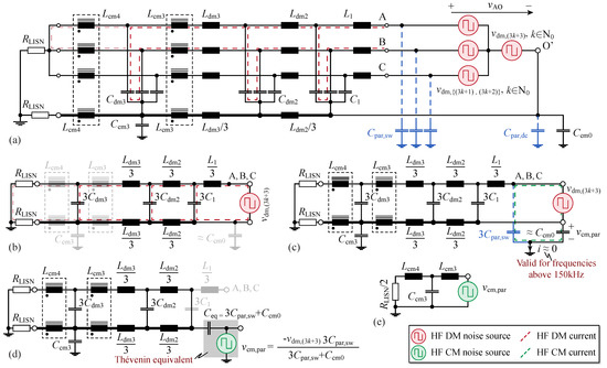 The DM equivalent circuit is depicted in Figure 7a. Due to the interleaved modulation of the three active bridges of the PFC rectifier, ideally, only the multiples of the switching frequency that are equal to , are relevant as they are common to all three phases and appear in the LISN; the remaining HF harmonics do not lead to significant voltages at the LISN.