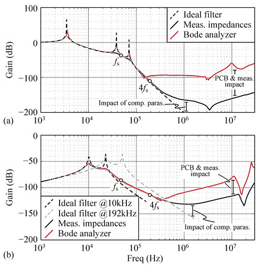 Comparison of (a) DM and (b) CM filter transfer functions: (i) calculated for ideal components (dashed lines), (ii) calculated based on individually measured impedance characteristics for each filter component (solid black lines), and (iii) measured directly on the PCB using the Bode100 network analyzer from OmicronLab (solid red lines).