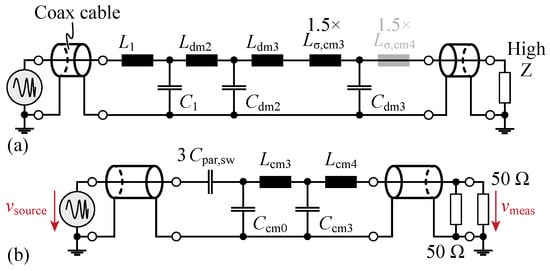 Equivalent filter circuits for the measurements of the (a) DM and (b) CM transfer functions shown in Figure 8a,b.