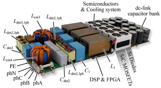 Furthermore, Figure 6a considers the three parasitic capacitances between the switch-nodes and PE, because these capacitances are found to have a substantial impact on the effective CM attenuation of the EMI filter. (Due to the grounded heat sink, the value of can be approximated by the total surface of the metallic backplates of the low-side MOSFETs and the thickness and the permittivity of the interface material [29,30], which for two parallel MOSFETs (TO-247 packages) per switch leads to ).
