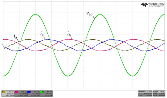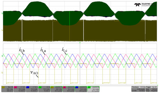 The value of the current ripple has been determined such that, in case of 1-phase operation, the diode bridge-leg is not subject to parasitic HF switching operations around the zero crossing of the phase current, due to the superimposed HF ripple. As the three phases are modulated with interleaved carriers during 1-phase operation, the HF ripple of the current in the rectifier diodes only contains harmonic components at and multiples thereof (cf. Section 4). Furthermore, the superimposed HF ripple leads to a total current in the return path that is limited by an upper and a lower envelope. In our case, the lower envelope is of interest, because it enables the derivation of a condition for such that parasitic HF oscillations of the diode bridge-leg ac-side voltage are avoided. The expression for the lower envelope of the return current can be estimated with the mains current fundamental component and the amplitude of the spectral component at , calculated from the Fourier series of the rectangular waveform of the switch-node voltage,
