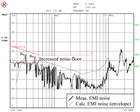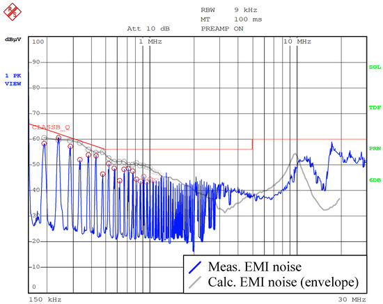 This section provides individual analyses of the EMI noise components that occur in case of 3-phase and 1-phase operation. According to the work in [28], the peak EMI noise levels measured with a test receiver that complies with the CISPR 16 regulation, e.g., featuring a receiver bandwidth (RBW) of 9 kHz, can be approximated with