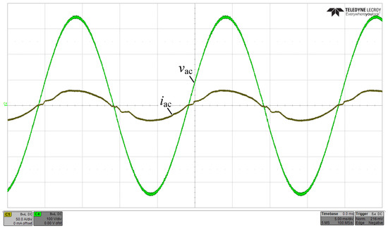 According to (2), parasitic HF switching of the diode bridge-leg is avoided if the gradient of the LF term is greater than the gradient of the amplitude of the 3rd harmonic at . For output power levels greater than 2.5 kW, this condition leads to , which translates into a peak-to-peak current ripple of 60%. In case the specifications require operation at lower power, low-power MOSFETs or IGBTs can be placed in parallel to the diodes, to clamp the path of the current around zero-crossings.