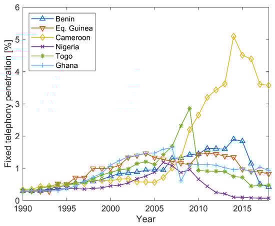 Fixed telephony penetration in the Gulf of Guinea (based on data available from [25]).