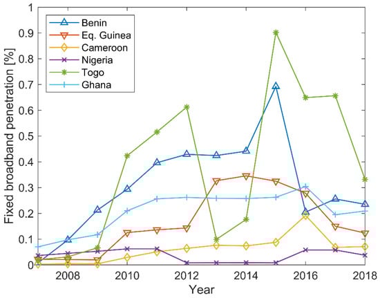 Fixed Broadband penetration in the Gulf of Guinea (based on data available from [26]).