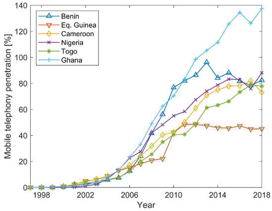 Mobile telephony penetration in the Gulf of Guinea (based on data available from [27]).