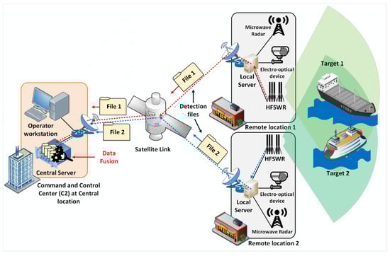 The HFSWRs are deployed at two remote locations on the coast of the Gulf of Guinea that are 100 km apart. Both locations are more than 500 km away from C2 center (central location) where the data fusion is performed. All three locations are connected via the satellite links, as shown in Figure 4, representing a generic communication architecture. The data flow for the IoT OTH maritime surveillance service starts with collecting of the raw data by the sensors at two remote locations. The initial processing of the collected data during which the detection files are created is performed on local servers, situated at remote locations. Then the implemented script on local servers starts sending the detection files to central server at Command and Control Center via satellite link using TCP protocol. The algorithm for data fusion, implemented on the central server, uses successfully transferred detection files to produce the final result in the form of accurately detected targets that are being tracked. Time, and thus transmission via the mentioned satellite link, is a key factor in successful pairing of detection files from different remote locations that should participate in the fusion process.