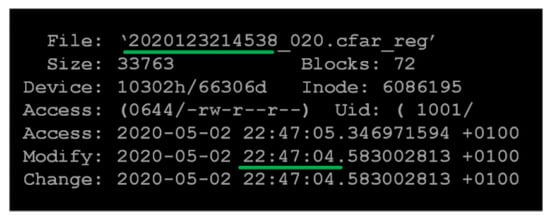 The created cfar_reg file is accessed by a script for sending data. The file is sent via a satellite link as shown in Figure 4. From both remote locations, new files are sent to the central location in equal periodical intervals in order to make the vessel tracking process smooth. The client side, located at a remote location, initiates the sending of files to the server side at the central location. The server side receives the files and writes them on the disk of the central server where implemented algorithms perform target tracking and multi-sensor data fusion [14,15,16]. As it can be seen from Figure 5, data collection started at 21:45:38, while the cfar_reg file was created (modify time) at 22:47:04. One-hour difference is due to the difference between local time and UTC time used in the creation of the file name and should be neglected. The important information lies in difference between minutes and seconds. In this case it is 86.58 s, which is a time needed to completely collect, process and transmit the data at the HFSWR level. Of course, this is just an example and actual times can vary, but it provides an explanation regarding time stamps which are discussed in the following sections.