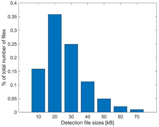 The C2 center performs fusion on HFSWR data received from both HFSWR locations. Bandwidth assigned for the HFSWR data transmission is 128 kb/s, where 64 kb/s is assigned for control commands, and the other 64 kb/s is assigned for the transmission of detection files. Naturally, the file size impacts the file transfer time. Thus, detailed distribution of the file size analyzed over the period of one year is shown in a form of histogram in Figure 6. Please note that file size depends on various factors such as density of traffic in the HFSWR coverage area, and number of false detections, which depends on weather conditions, and ionospheric interference.