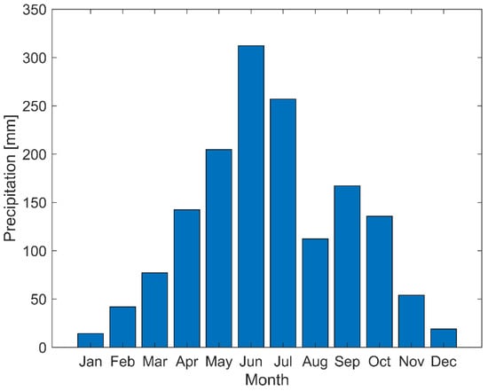 In the zone of interest there is a clear distinction between dry and rainy periods in the year. Dry season, which has its peak from December to February, is considered as a good weather period from the satellite link point of view, since rainfall is minimal and storms are quite rare. On the other hand, the period from May to July (peak of rain season) is considered as a bad weather period, since during that period rain occurs daily and violent storms are quite frequent. Figure 7 gives an overview of rain precipitation during a year in the zone of interest based on the data from the World Meteorological Organization [28]. Figure 7 shows that the period May–July is the rainiest while the period December–February is the driest.