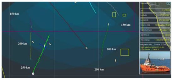 Such atmospheric conditions are characterized by clear and sunny weather with low intensity wind. The effects of such weather on the operation of HFSWRs are practically negligible. The main reason is the fact that the light wind, which characterizes such weather, has very little effect on the surface of the sea by producing waves of low altitude. Under these conditions, the sea state does not exceed 3 according to the Douglas scale [31], and according to [32], the propagation of EM waves across the sea surface is the best possible. As far as the vessel detection is concerned, it is possible even beyond the nominal HFSWR range. One such example is presented in Figure 8.