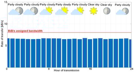In Figure 8, the vessel detection and tracking at a distance of 270 km is shown, which is well beyond the nominal HFSWR range. Furthermore, the clear weather does not introduce any difficulties in the operation of the satellite links, and there are no problems with communication between the HFSWRs and the command centers. This means that data will arrive in a timely manner and without significant delays. In clear weather there are no data delays, so it can be said that the IoT OTH maritime surveillance service operates in optimal conditions. Figure 9 shows the satellite link operation in one day by hour during a period in a day in the conditions of the “calm sea” (at the top of the Figure, we have shown the weather conditions for that day in parallel).