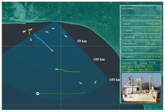 As it can be seen from Figure 10, the storm does not cover the coast itself, but “only” a large part of the HFSWR coverage area. Under these weather conditions, the range of HFSWR decreases due to the harsh surface wave propagation conditions [32]. This directly causes decline in the HFSWR vessel detection capabilities. In Figure 11 the detection capabilities of one HFSWR under the conditions described above are shown.