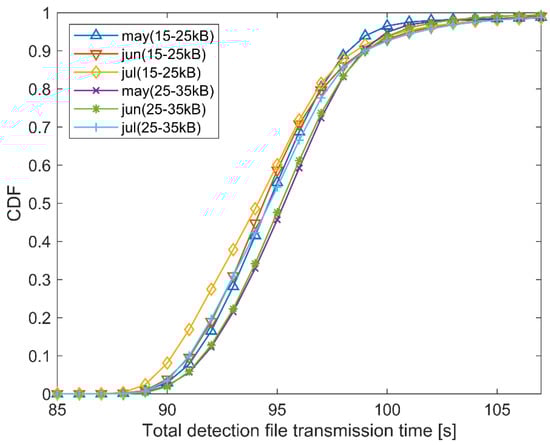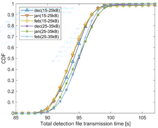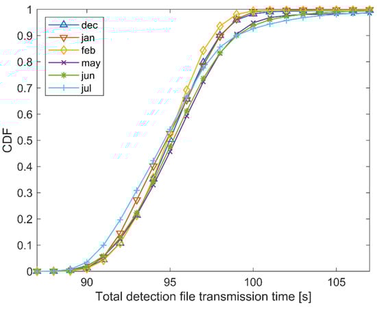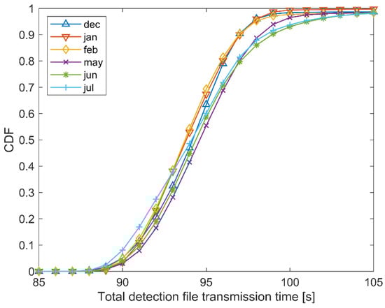 Figure 15 shows the cumulative distribution for the 15–25 kB range, while Figure 16 shows the cumulative distribution for the 25–35 kB range. Figure 15 and Figure 16 show the three rainiest months (May–July) and the three driest months (December–February), with the idea to observe whether there are some differences in the total detection file transmission times. The CDF of the rainiest months reaches the value 1 later than the CDF of the driest months. This means that, on average, it takes more time to transfer files to the central location when the weather conditions have more negative impact on the satellite link. However, given that the overall system is robust and can tolerate differences up to several seconds, the given differences in total detection file transmission times between the worst and the best weather condition months are acceptable.