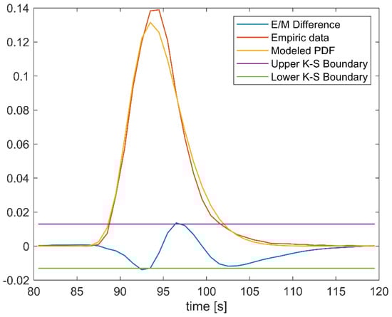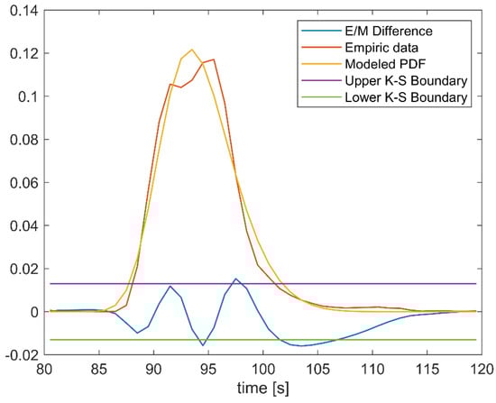 As it can be seen from Figure 19 there are some differences between the empirical data and modeled PDF, which are presented with red and orange lines, respectively. These differences cause that difference in CDFs of empirical and modeled data (blue line, denoted with Empiric/Modeled (E/M) Difference) goes over the boundaries set by the Kolmogorov–Smirnoff (K-S) test (purple and green lines, denoted with the Upper K-S Boundary and Lower K-S Boundary). However, although some irregularities exist, it may still be said that the modeled PDF can be used to describe behavior of the empirical data with a good accuracy, because K-S boundary is violated for only ~5% of samples with the maximum violation of ~6%.