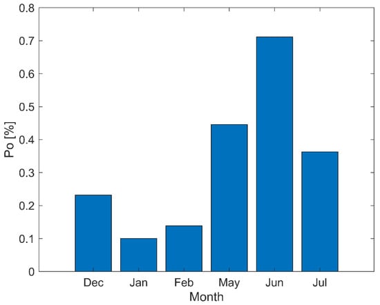In Figure 21 the outage probabilities are shown for the three rainiest and the three driest months as we expect that the rainier months should have a greater outage probability. Figure 21 shows that the rainier months indeed have a greater outage probability which comes from worse weather conditions on average (Po: 0.1–0.25% in good weather conditions, 0.35–0.7% in bad weather conditions).