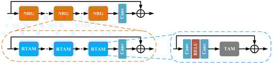 where and represent the input and output feature maps of the n-th RTAM in the m-th NRG. denotes the corresponding function.