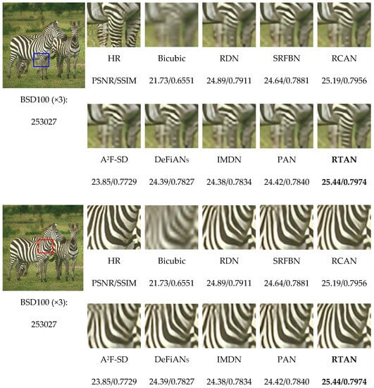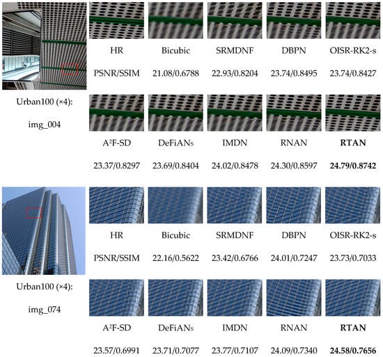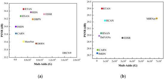 We further measure the computational efficiency of each method for different SR tasks, as shown in Figure 8a,b. From Figure 8a, we observe that the proposed RTAN achieves best performance with less Mult-Adds as compared to DBPN, DRRN, RDN, EDSR, and DRCN. Similar comparisons are further presented in Figure 8b, which shows that the proposed RTAN is more efficient than RCAN, MIRNet, and EDSR. As compared with other larger models, the proposed RTAN attains the balance between the performance and the computational complexity which is considerable from practical applications point of view.